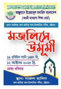 আগামী ১৯ রবিউস সানি ১৪৪৭ হি. মোতাবেক ১২ অক্টোবর ২০২৫ ইং. রোজ: রবিবার আল-জামিয়া আল-ইসলামিয়া পটিয়ার দারুল হাদিসে আঞ্জুমানে ইত্তেহাদুল মাদারিস বাংলাদেশ এরমজলিসে উমুমী অনুষ্ঠিত হবে ইনশাআল্লাহ।